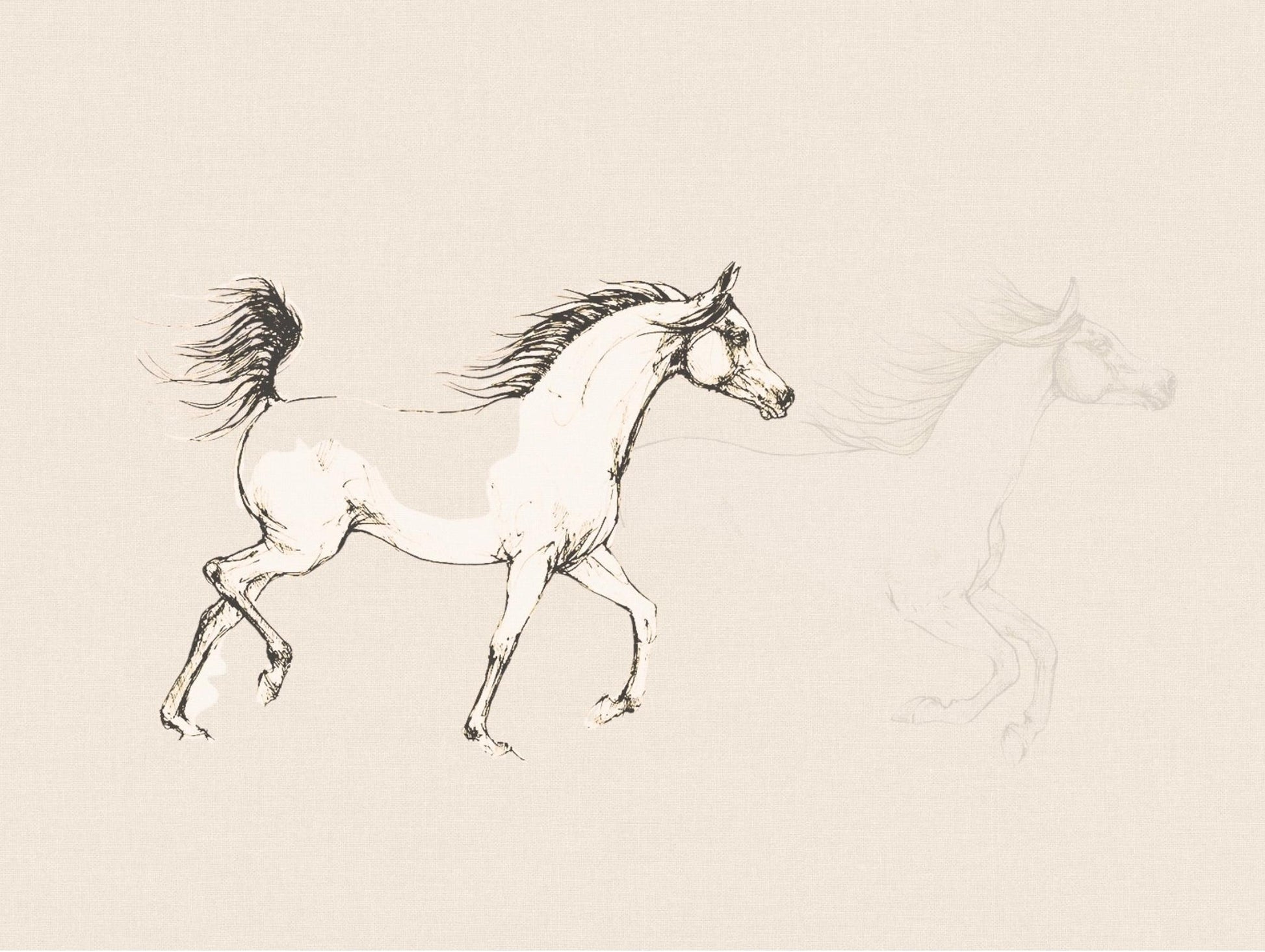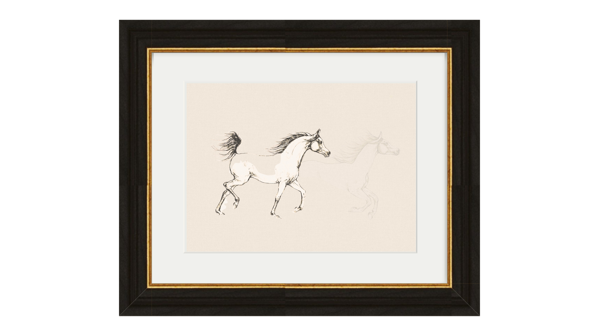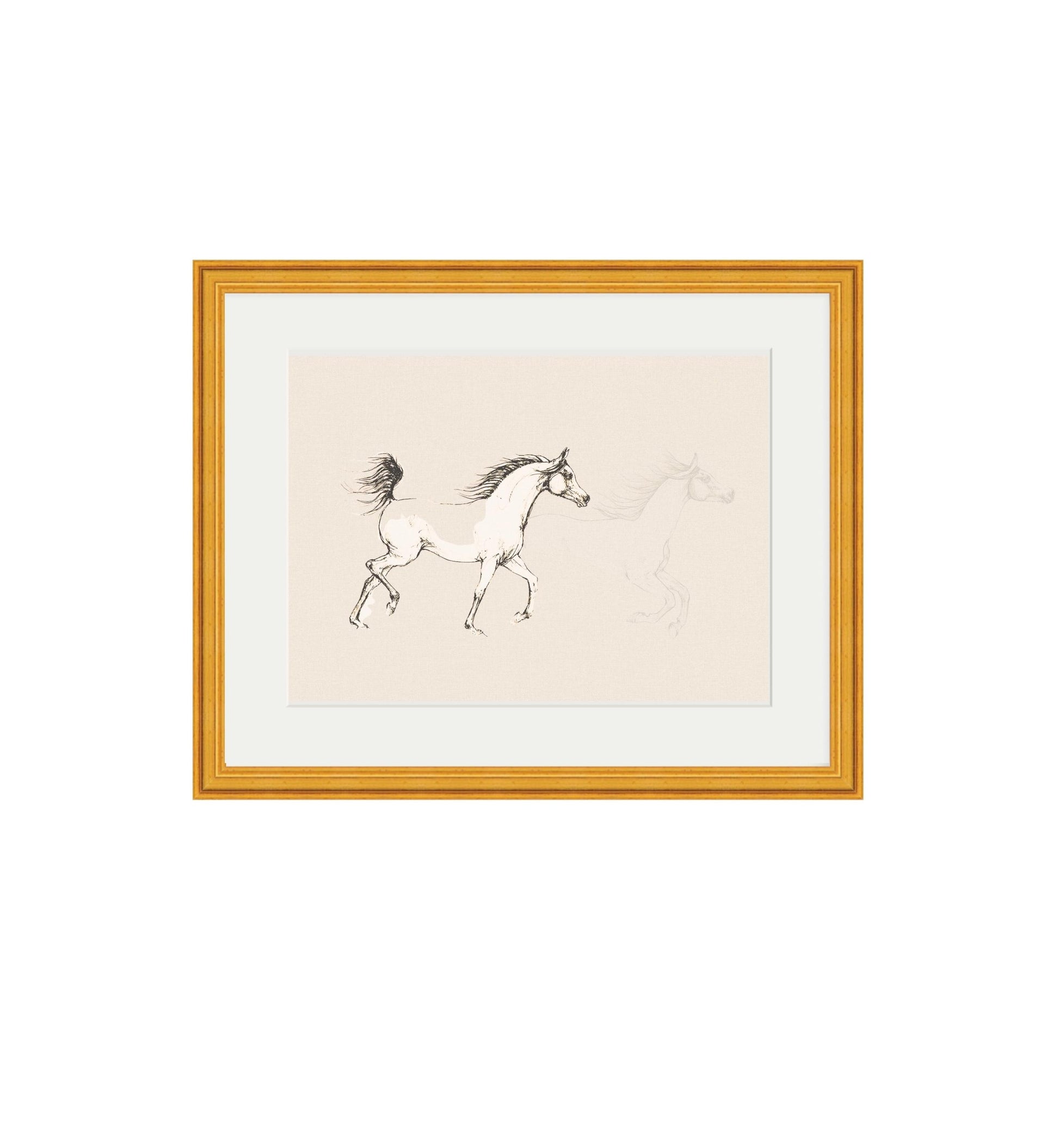sketch of an Arabian horse in motion, drawn with soft, expressive lines that highlight the grace and beauty of this iconic breed. Set against a light textured background and framed in a classic black frame with gold detailing, this piece brings a sense of movement, elegance, and timeless artistry to any room.